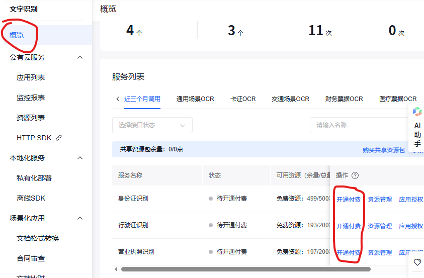 4、点击“概览”,找到身份证识别、行驶证识别、营业执照识别,点击开通付费即可。